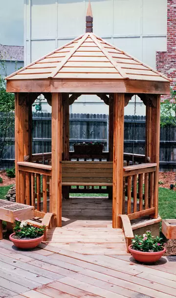 For trim and finishing touches, there are many different wood railing designs for decks, lattice privacy screen designs, vinyl privacy screens, wooden outdoor privacy screening, garden gate designs, decorative cedar fences, benches, planters, etc. We frequently incorporate subtle low voltage atmosphere and accent lighting.