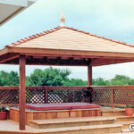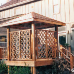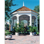 We can customize your gazebo in various ways. The vast majority have solid roofs (usually shingles or shakes of one type or another,) railing and open sides. Sometimes we pick up on elements of the house or other structures in designing the gazebo. We can incorporate screens, windows, wood lattice, vinyl lattice, glass, “Lexan” thermoclear and other things into our gazebos. There are many options available for posts, railing, benches, trim, ceiling treatment, cupolas, types of roofing, multi-level or multi-pitch or curved rooflines, lighting, etc. Floors can be wood, concrete, brick, mulch or turf depending on the situation.