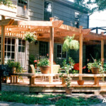 We always begin with function, i.e. what the arbor or pergola will do for you. Shade is the most frequent function. Rain protection, privacy screening, porch swing holders and creating a cozy outdoor room atmosphere are common requests. Often, the structure helps define, accent or block an area or view. Once we know what the arbor or pergola has to accomplish, we create designs that handle the functions and fit into the setting. There is usually a deck or patio underneath; so the arbor or pergola must blend with the scale, style, flow and elevation of the area. There are countless ways to design arbors and pergolas. We discuss lots of options with our clients and listen to their input. Would it be best for it to be painted, stained or allowed to weather naturally? Do you prefer a clean finished edge or decorative ends on the rafters? What about lighting?